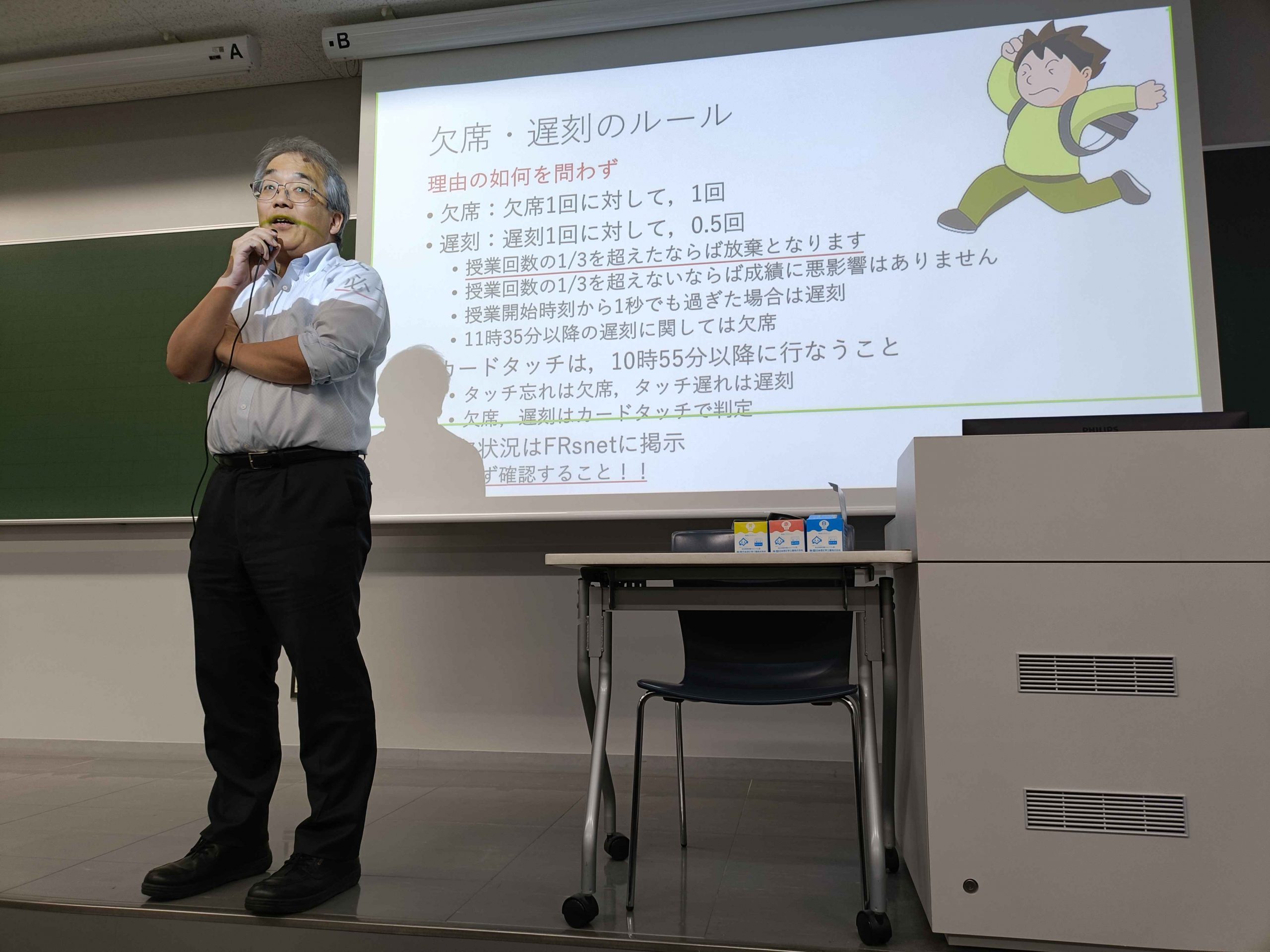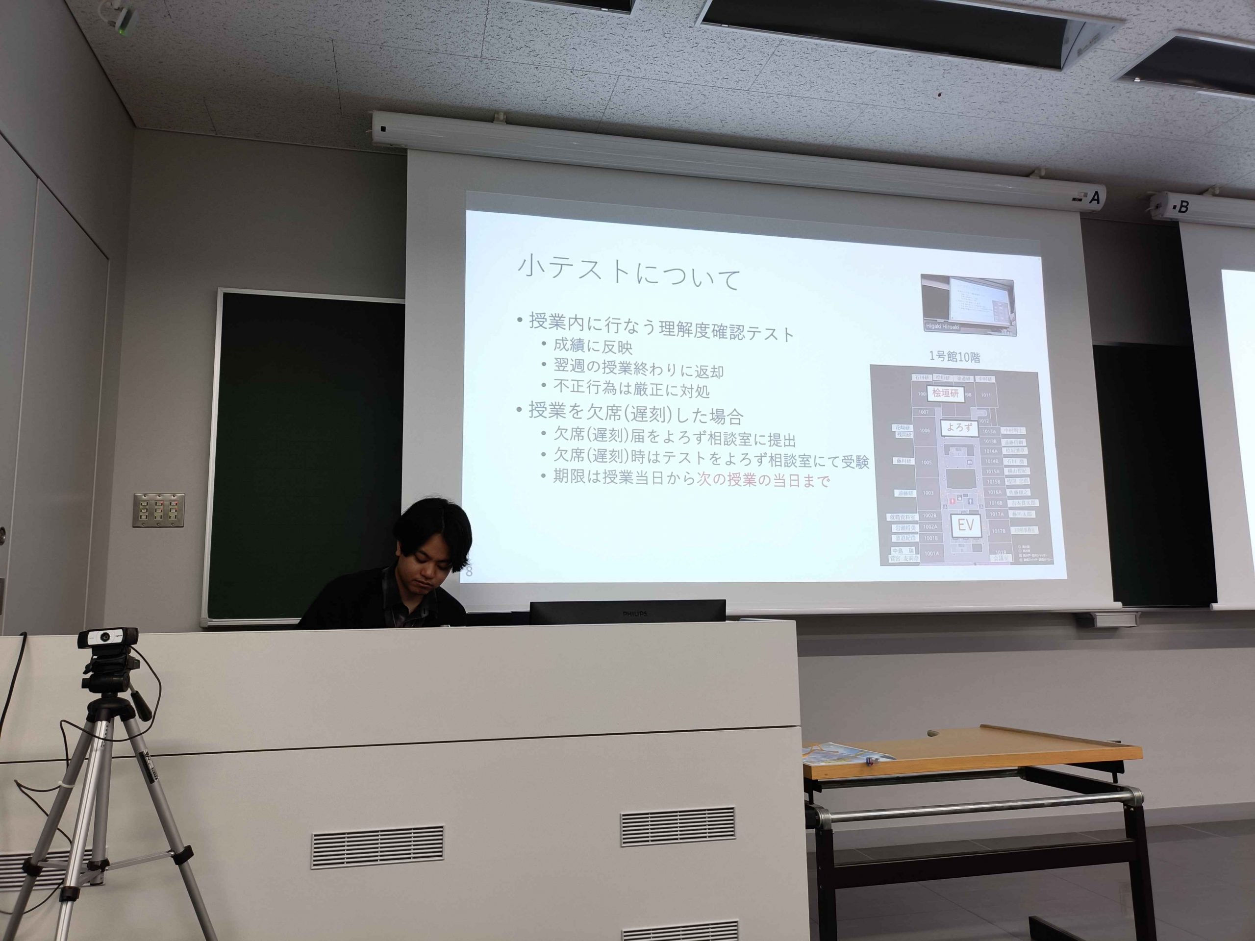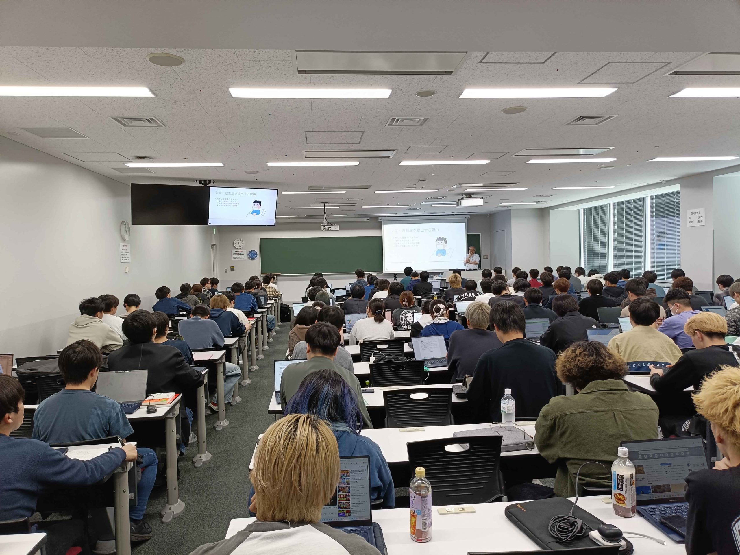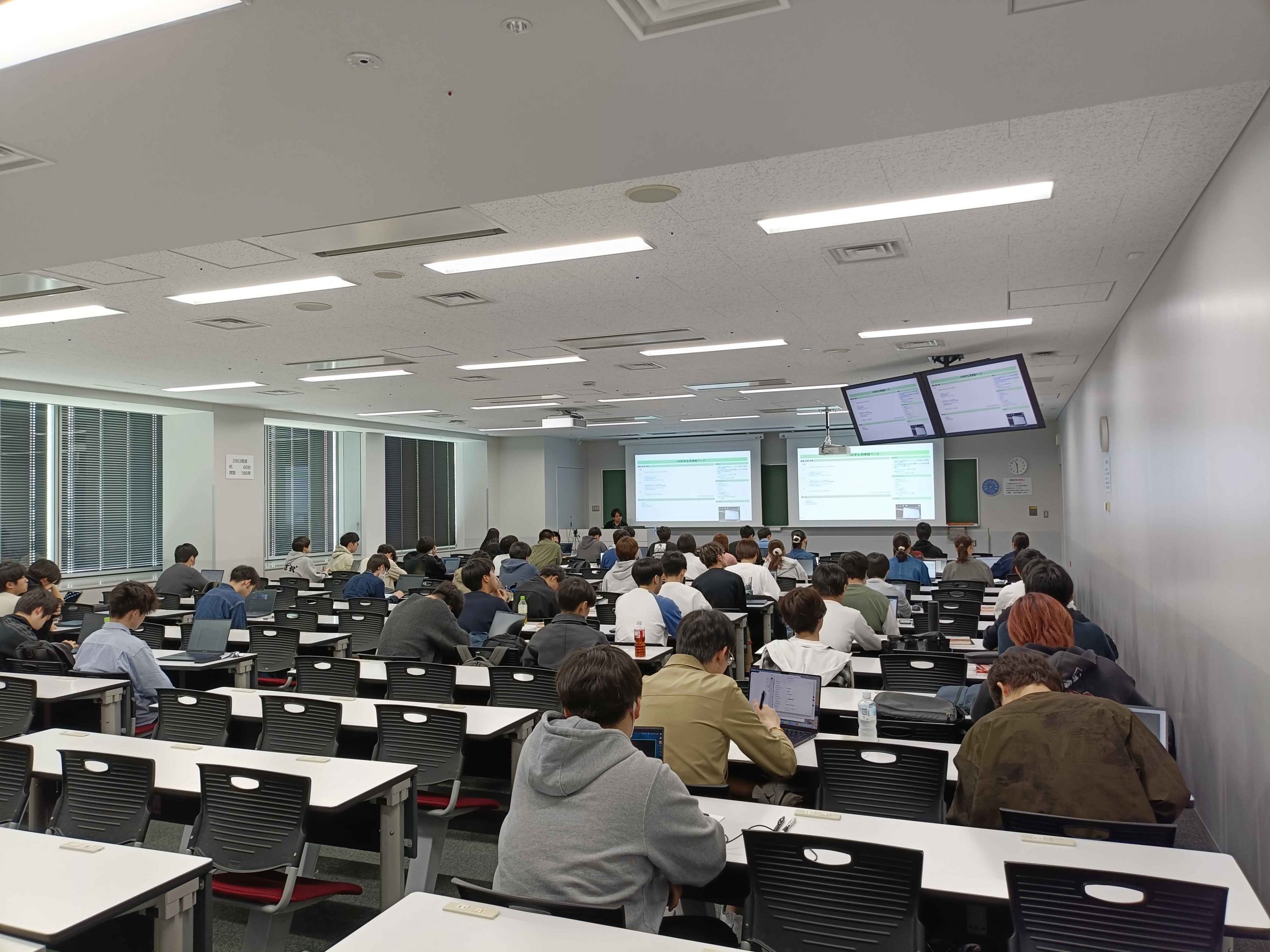 4/14 コンピュータ基礎 2026年4月14日、今日は一年生の情報系必修科目のコンピュータ基礎を取材しました。今年度は180人以上もの履修者を抱え,2教室を借りて講義しました。毎年繰り返し履修したいという人が続出する,指折りに人気がある講義ですね!?
