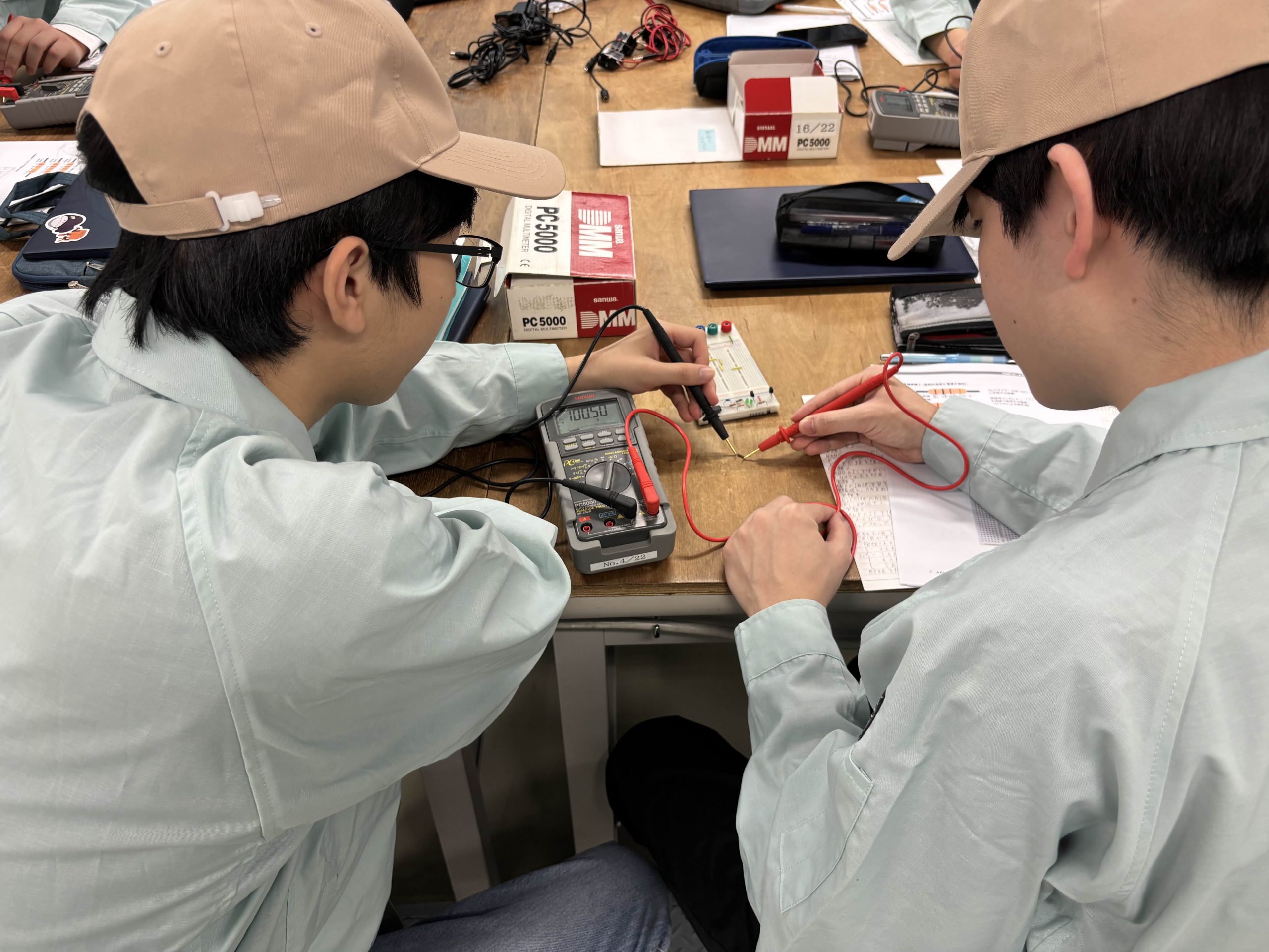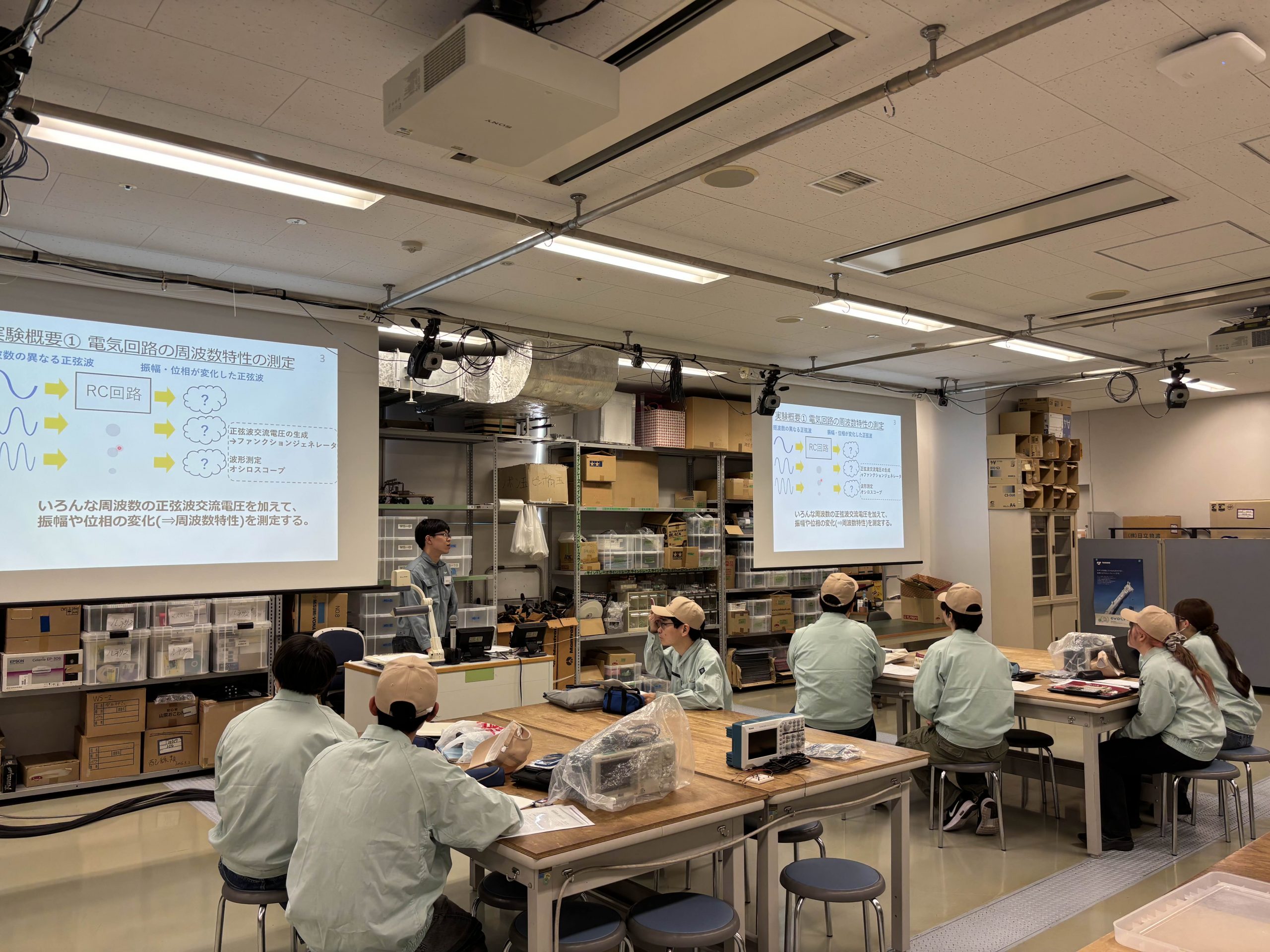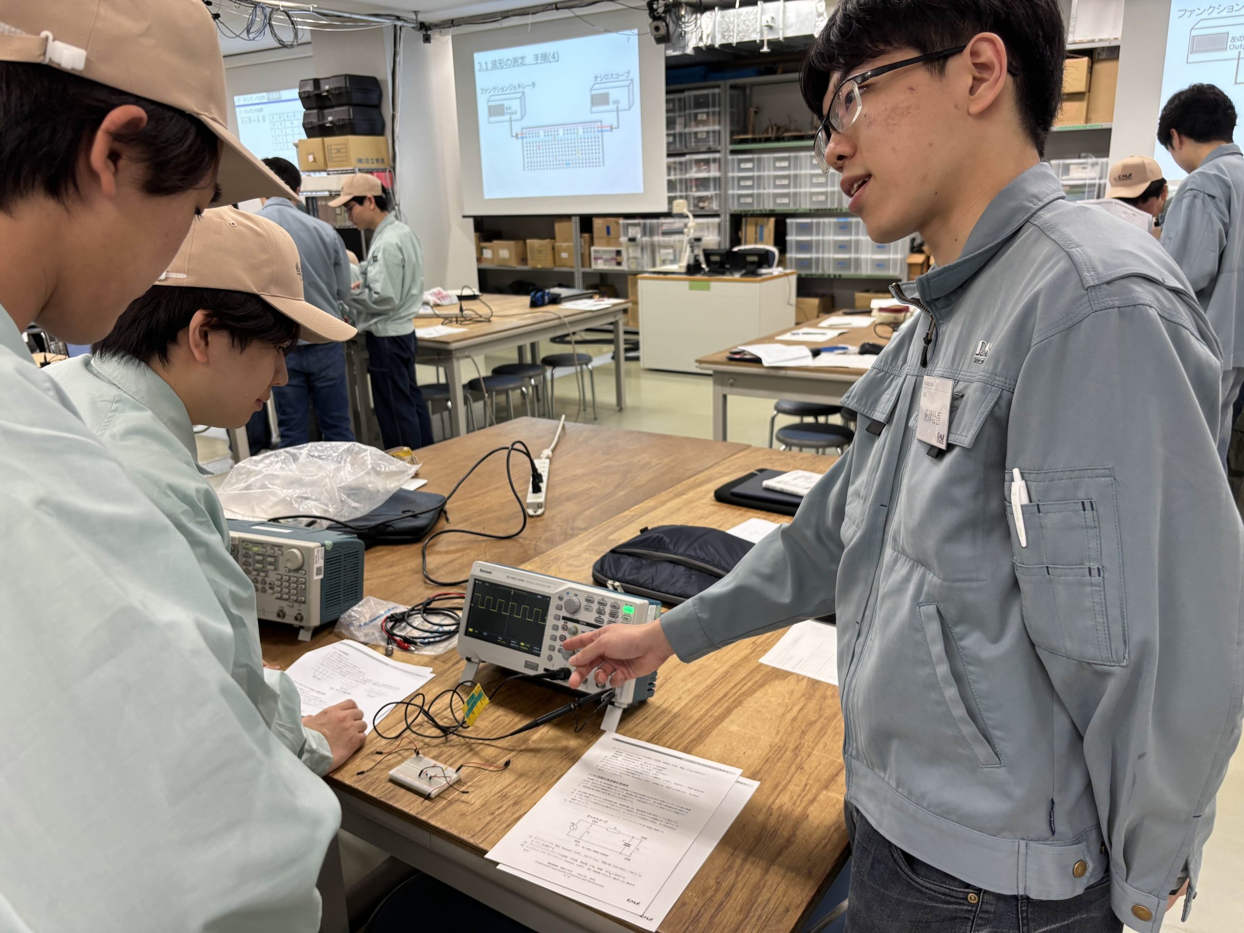 4/16 メカトロニクス基礎実験(Aテーマ) 2026年4月16日、今日は2年生配当の必修科目、メカトロニクス基礎実験を取材しました。基礎実験では,履修者がグループに分かれて技術屋さんなら知っておきたい、習得してほしい基礎部分を実習できます。何やらボタンがたくさんで難しいそうな機材に触れていますが、この基礎実験を通してロボメカ生ならだれでも安全に扱えるようになります。