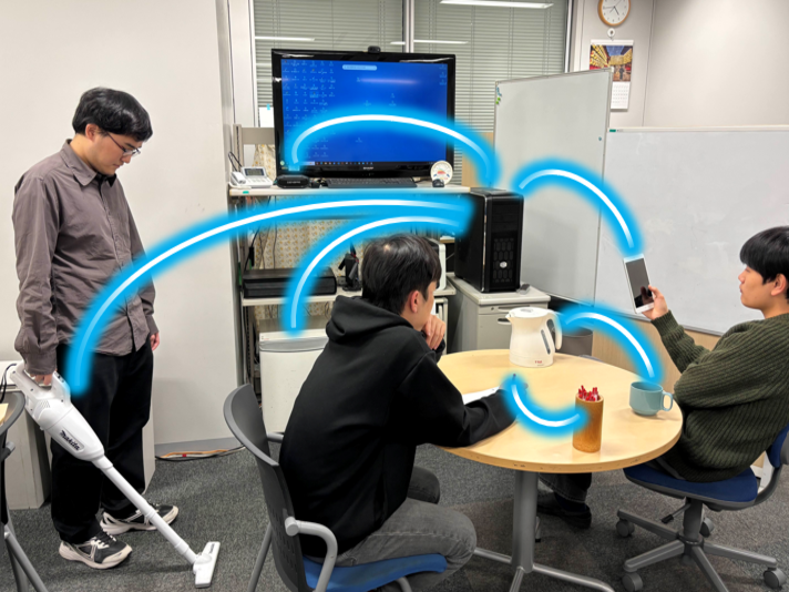 4/24 桧垣研究室 2026年4月24日、今日は4年生から例外なく所属することになる研究室を少し覗いてみましょう。下の写真は、アドホックネットワークおよび分散システムにまつわるプロトコルを主に研究する桧垣研究室です。 –>