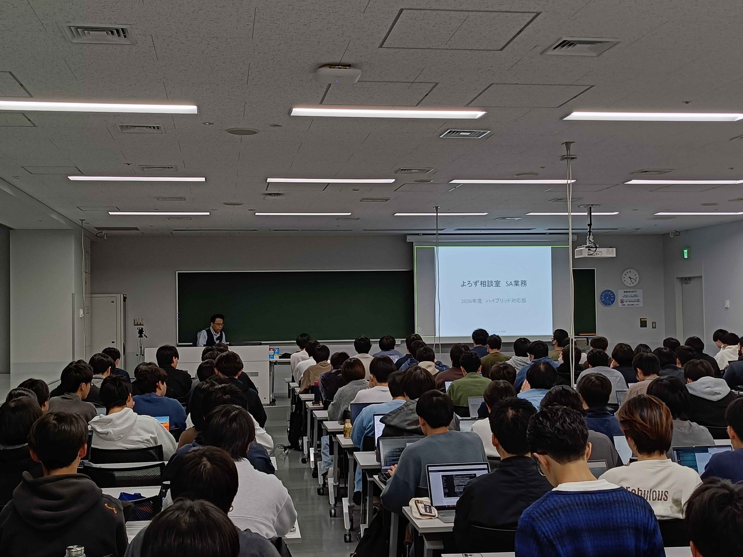 4/7 副手業務説明会 2026年4月7日、2026年度のTA・SA担当予定者を対象とした副手業務説明会を実施しました。全体説明に加え、科目対応やよろず相談室での業務について案内し、あわせてハラスメント防止講習も行いました。担当予定者が業務の概要を理解し、今後の活動に向けた準備を進める機会となりました。