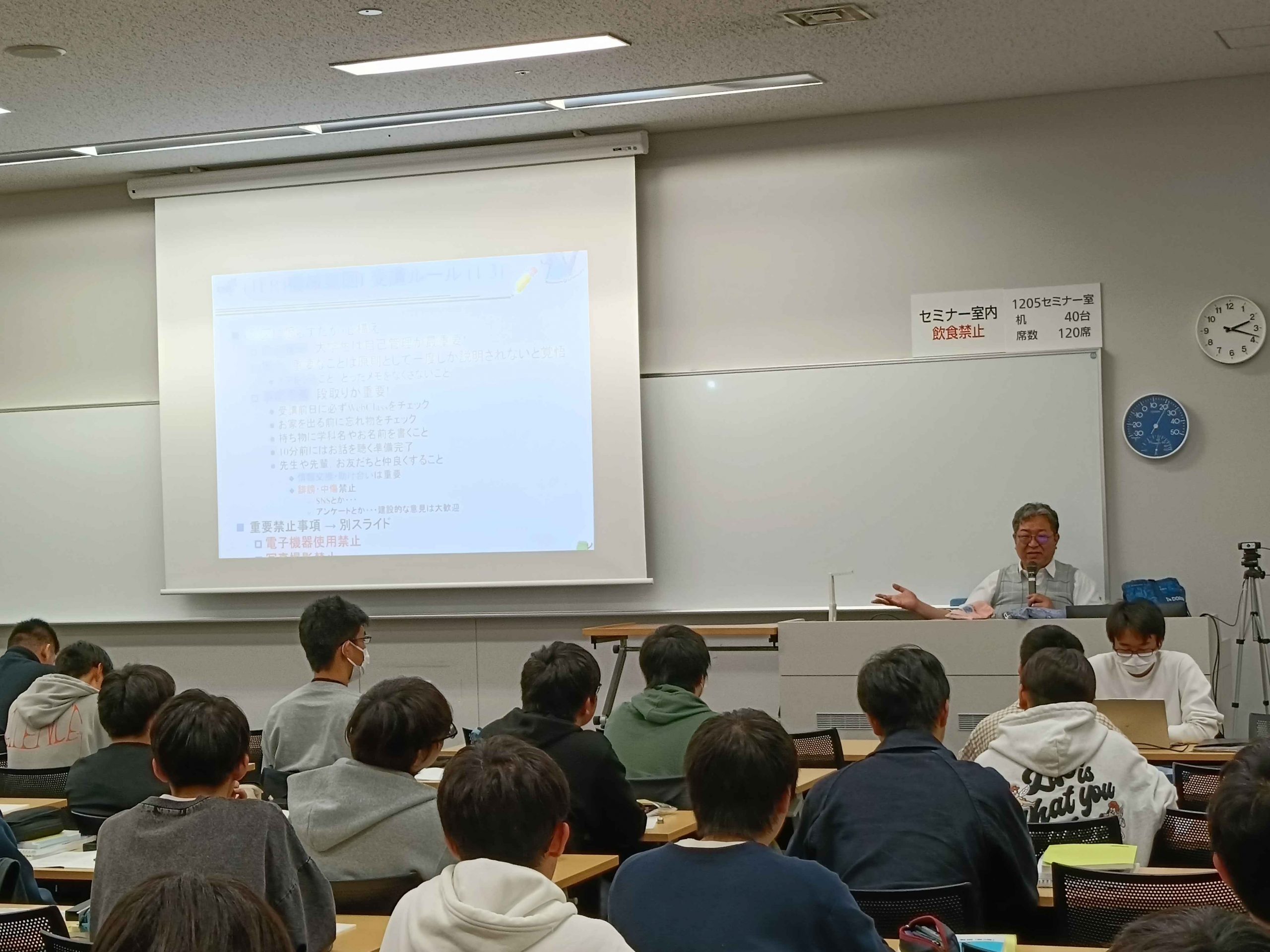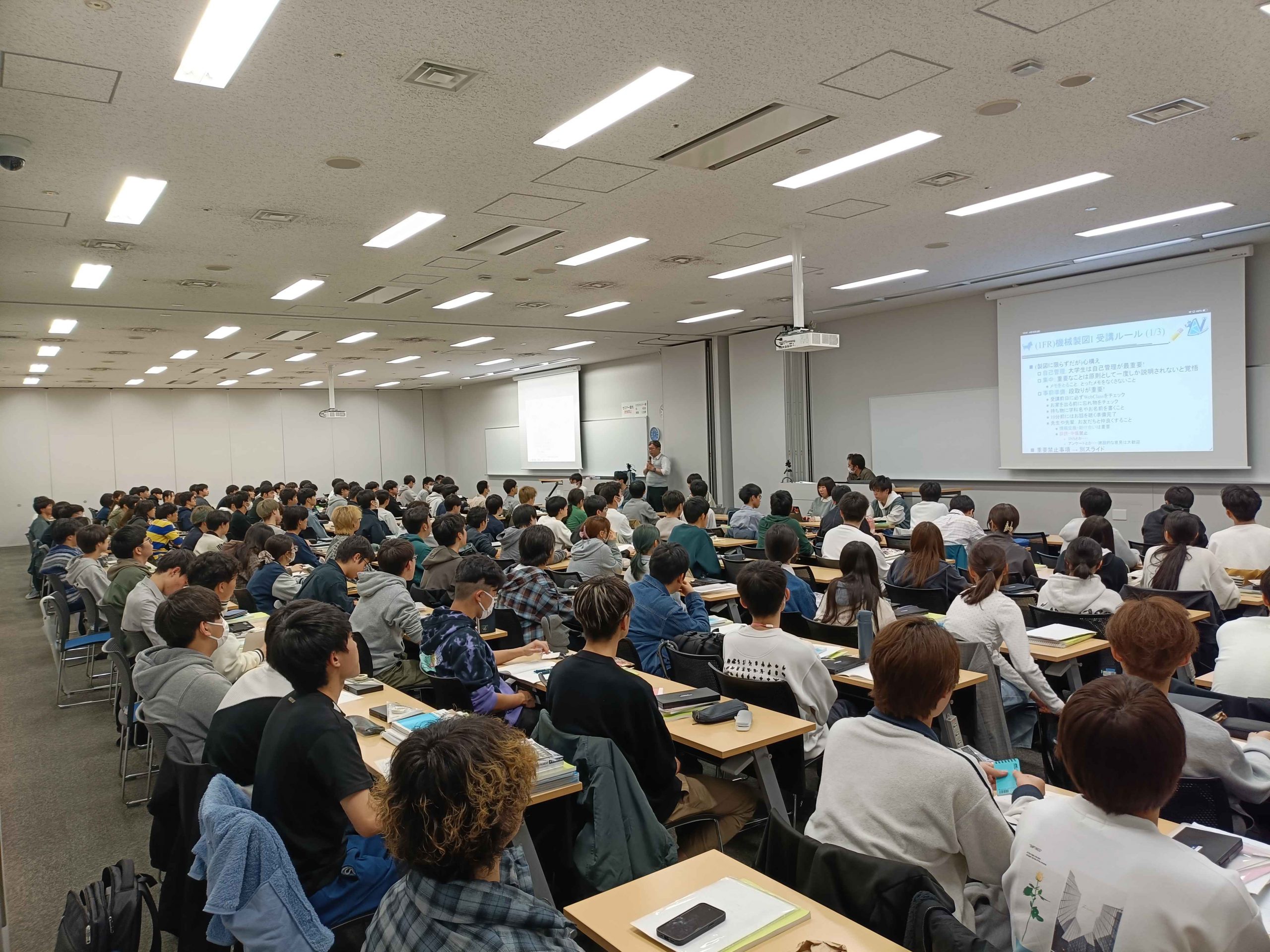 4/10 機械製図1 2026年4月10日、新年度の授業が始まりました。1年生は必修の機械製図1がさっそくです。 機械系の登竜門であるこの授業の重要性について、中村先生が熱く語ってくれました。学生も真剣な眼差しで取り組んでいました