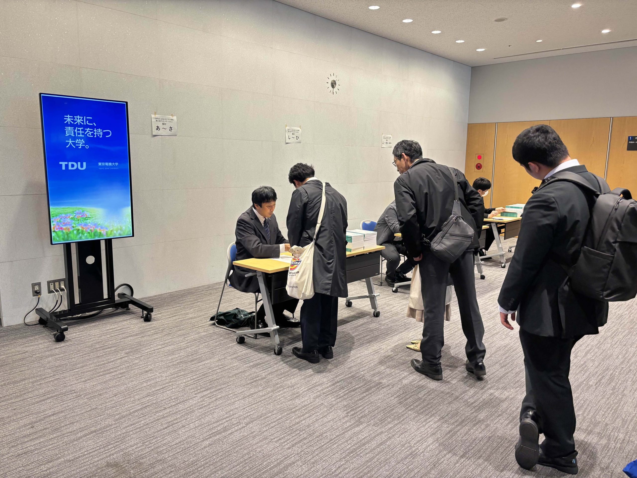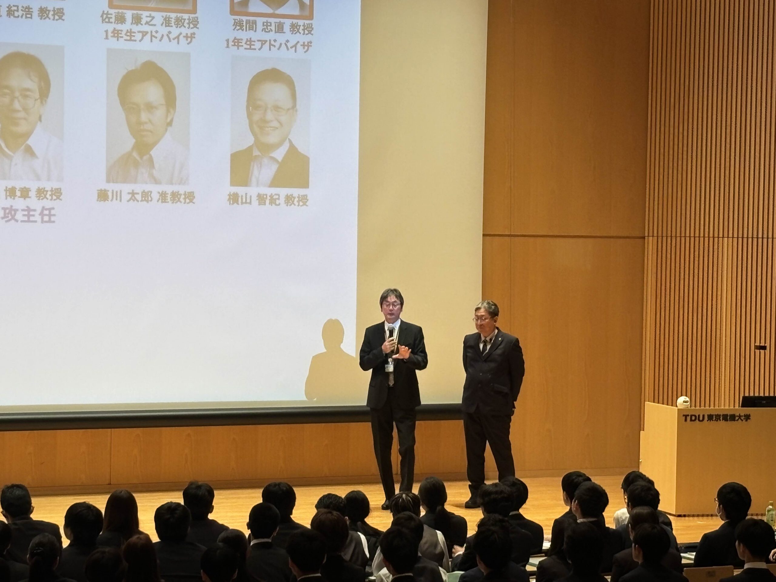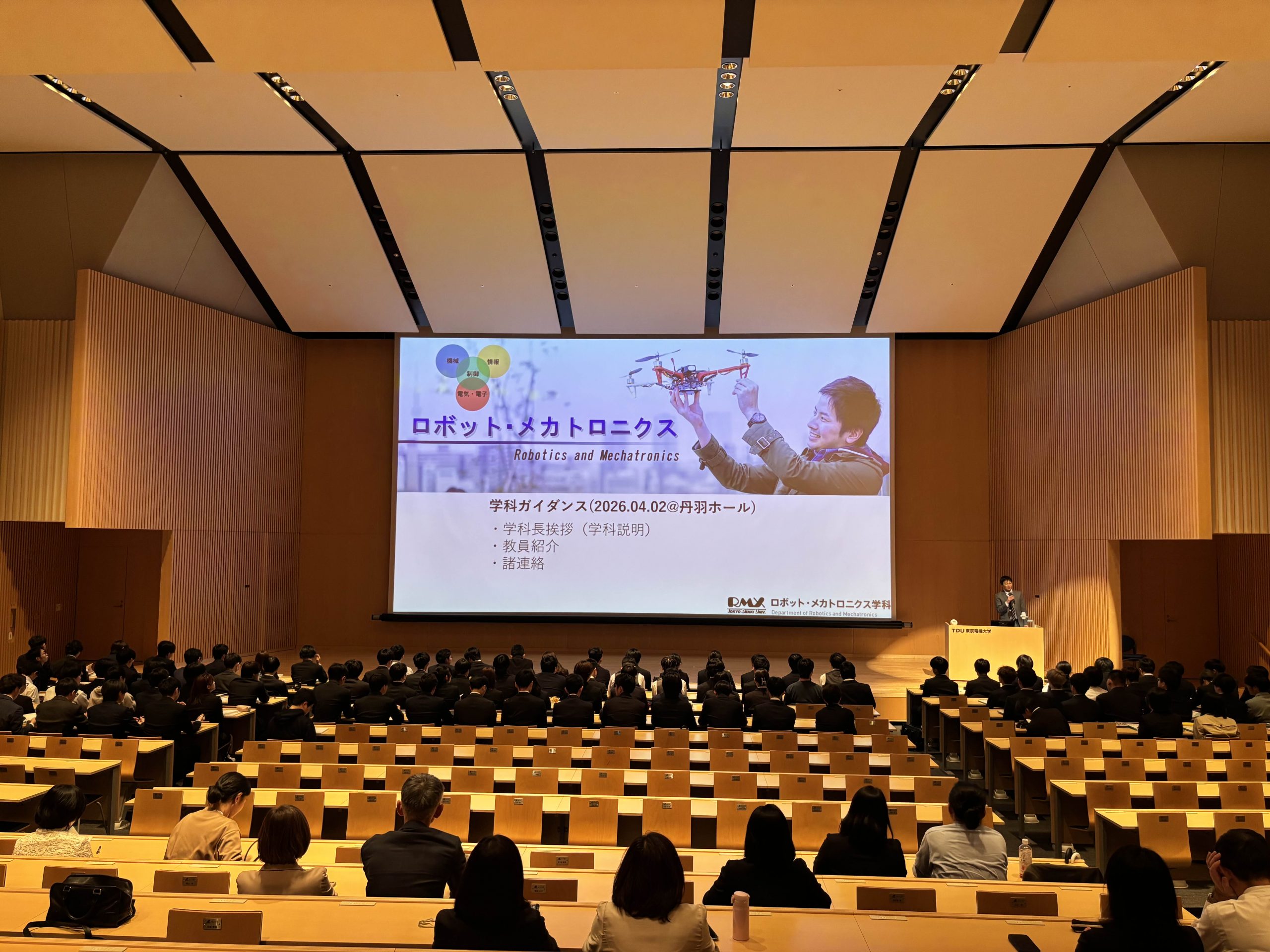 4/2 学部新入生ガイダンス 2026年4月2日、日本武道舘での入学式終了後、ロボット・メカトロニクス学科新入生と御父兄を対象としたガイダンスを 東京千住キャンパス 丹羽ホールにて実施しました。教職員スタッフの紹介に加えて、大学での学びへのアプローチ、大学院 進学の重要性についての説明がありました。