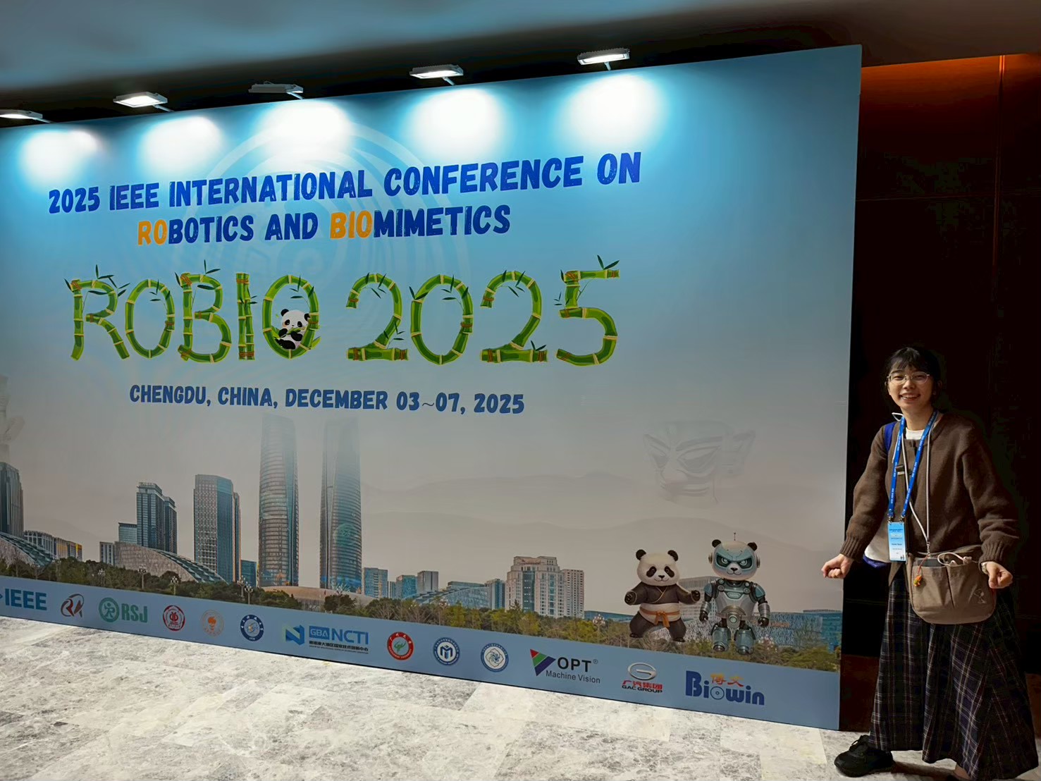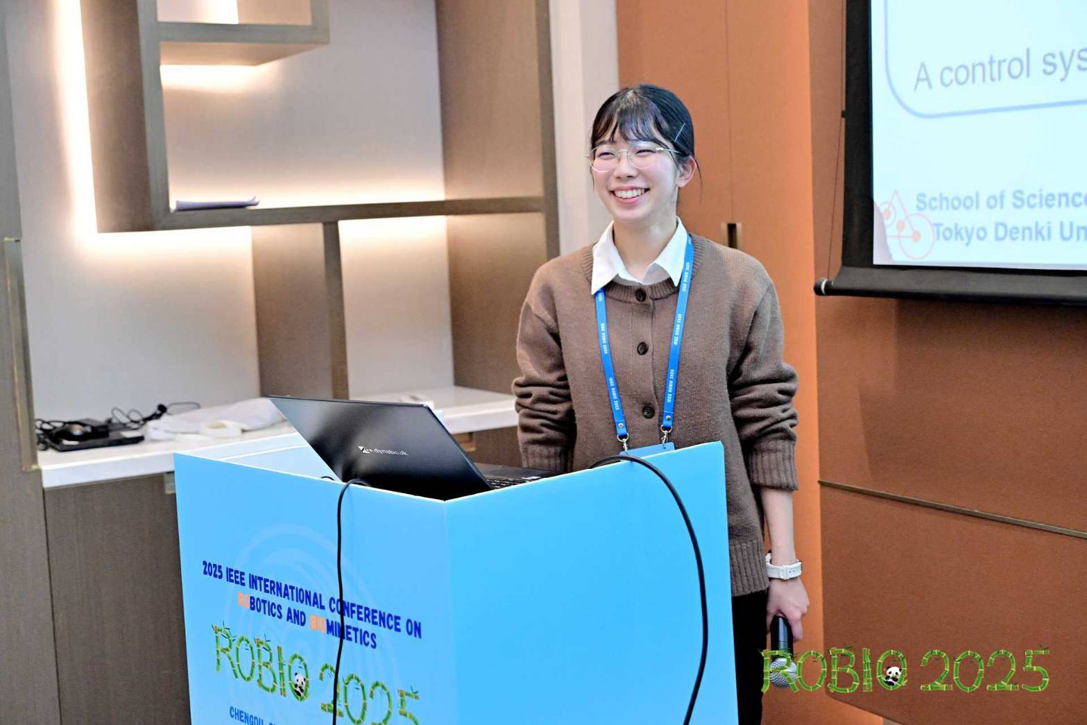- 中国の四川省成都で開催された国際会議ROBIO2025に参加しました。この学会は、IEEEのロボット工学とバイオミメティクスの学際的分野の研究者が最新の研究成果を発表し、共同研究の可能性を探るためのプラットフォームとなる国際会議でした。541件中395件(73 %)の採択率で、約420名が参加しました。29カ国の人が参加し、95 %が日本以外の人でした。私は学会3日目の「Cyborg Robots Ⅱ」のセッションで口頭発表をしました。初の国際会議であり、不慣れな英語の発表であったため、うまく受け答えができない場面もありましたが、有意義な議論ができました。懇親会では、日本の他大学の方と交流したり、現地の辛い料理や、中国の文化的な催し物をみたりと、楽しい時間を過ごせました。また、パンダ繫殖基地や杜甫草堂など、学会発表以外にも充実した出張となりました。